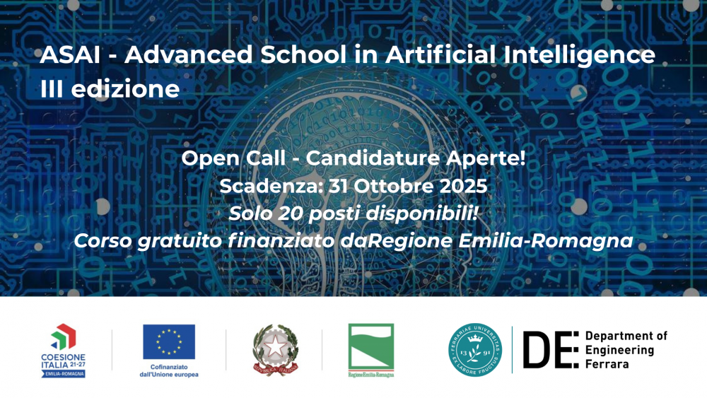 Sono aperte le candidature per la III edizione di ASAI – Advanced School in Artificial Intelligence, la scuola avanzata promossa dal Dipartimento di Ingegneria dell’Università di Ferrara con il sostegno della Regione Emilia-Romagna.