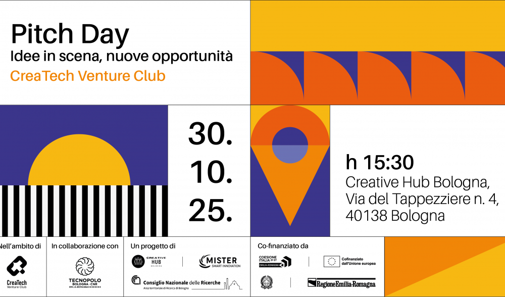 L’evento conclusivo del progetto CreaTech Venture Club, “Pitch Day: idee in scena, nuove opportunità” si terrà giovedì 30 ottobre a partire dalle ore 15:30 presso Creative Hub Bologna (Via del Tappezziere, 4, Bologna).