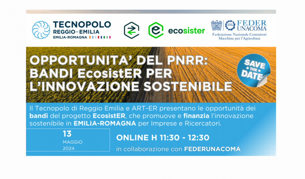 Ancora un appuntamento, questa volta organizzato dal Tecnopolo di Reggio Emilia e ART-ER in collaborazione con Federunacoma, per conoscere le opportunità dei bandi EcosistER per le imprese dell’Emilia-Romagna e per confrontarsi direttamente con i promotori dei bandi e i laboratori affiliati del progetto. Le iniziative rientrano all’interno del pillar sul Trasferimento Tecnologico TTIP: