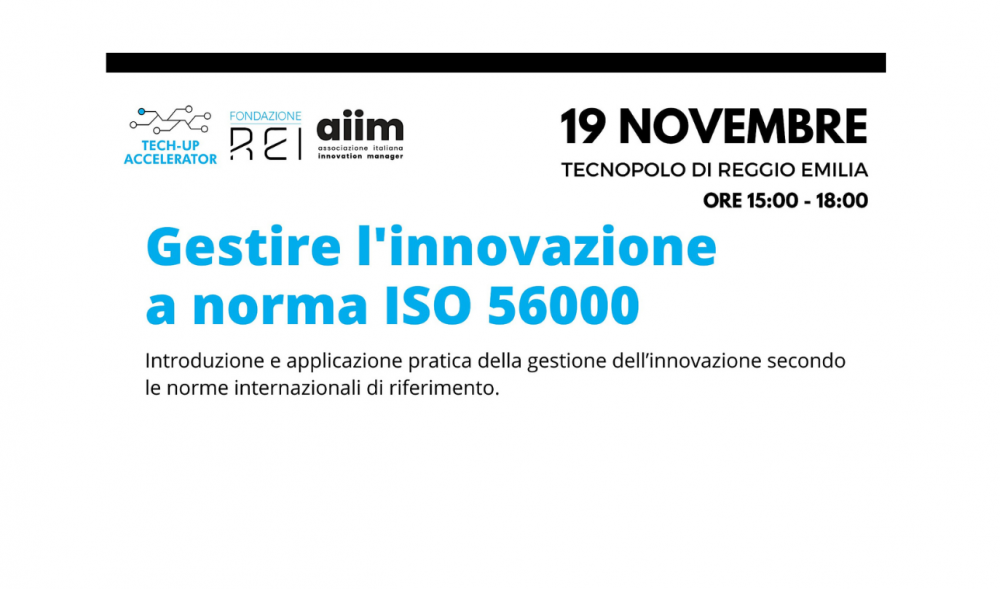 Il 19 Novembre 2024, presso il Tecnopolo di Reggio Emilia, si terrà l'evento Gestire l'Innovazione a Norma ISO 56000, organizzato dall'Associazione Italiana Innovation Manager in collaborazione con Fondazione REI.