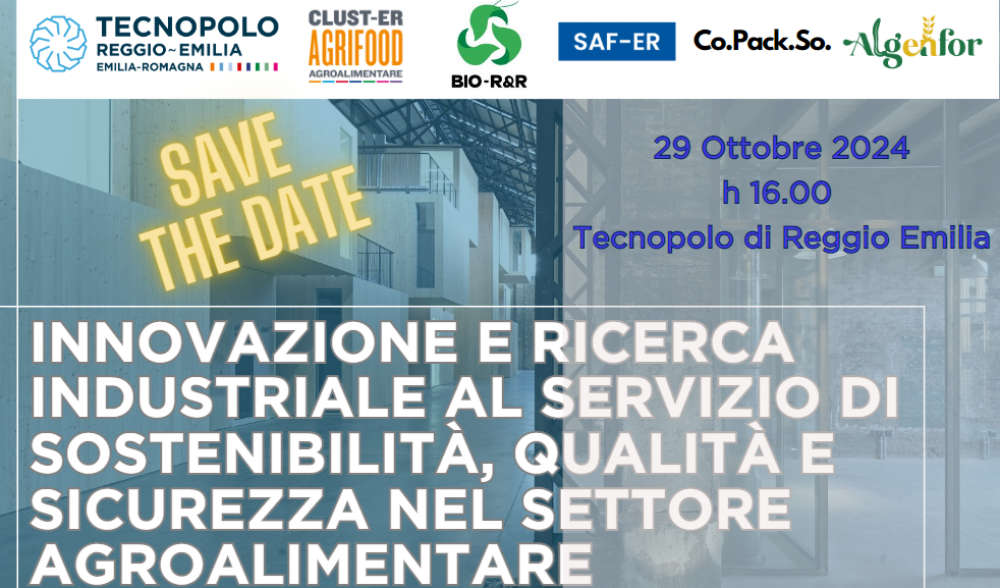 Martedì, 29 ottobre 2024, ore 16.00, presso il Tecnopolo di Reggio Emilia, ti aspettiamo all'evento dedicato alla valorizzazione dei progetti dei bandi Laboratori, dove approfondiremo come i progetti BIO-R&R, SAFER, Co.Pack.So. e ALGENFOR stanno lavorando per rendere la produzione alimentare più sostenibile, sicura e di alta qualità.