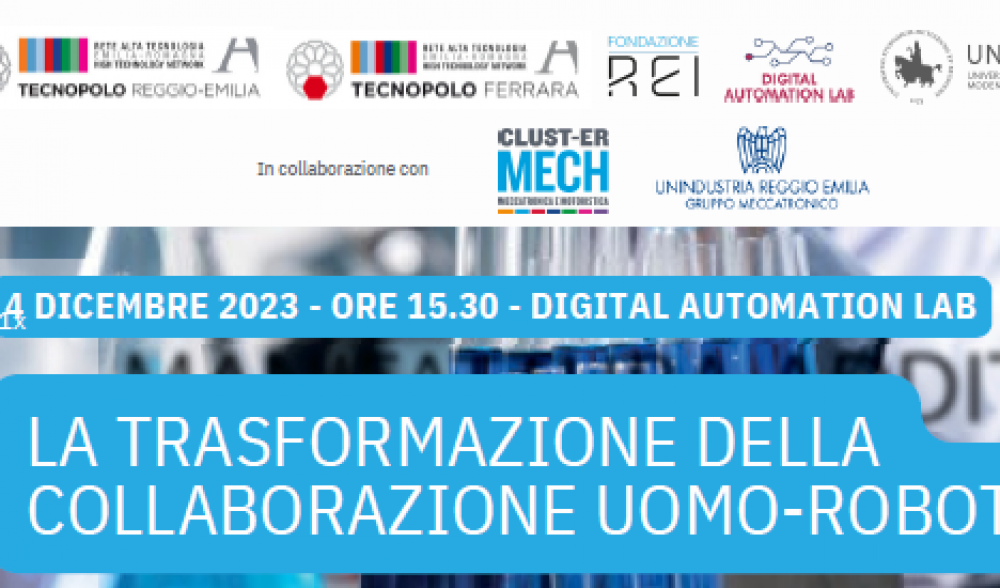 Il 4 dicembre, dalle 15:30, presso il Digital Automation Lab, Via Sicilia 21, a Reggio Emilia, l'evento La trasformazione della collaborazione uomo-robot, co-organizzato dal Tecnopolo di Reggio Emilia e dal Tecnopolo di Ferrara.