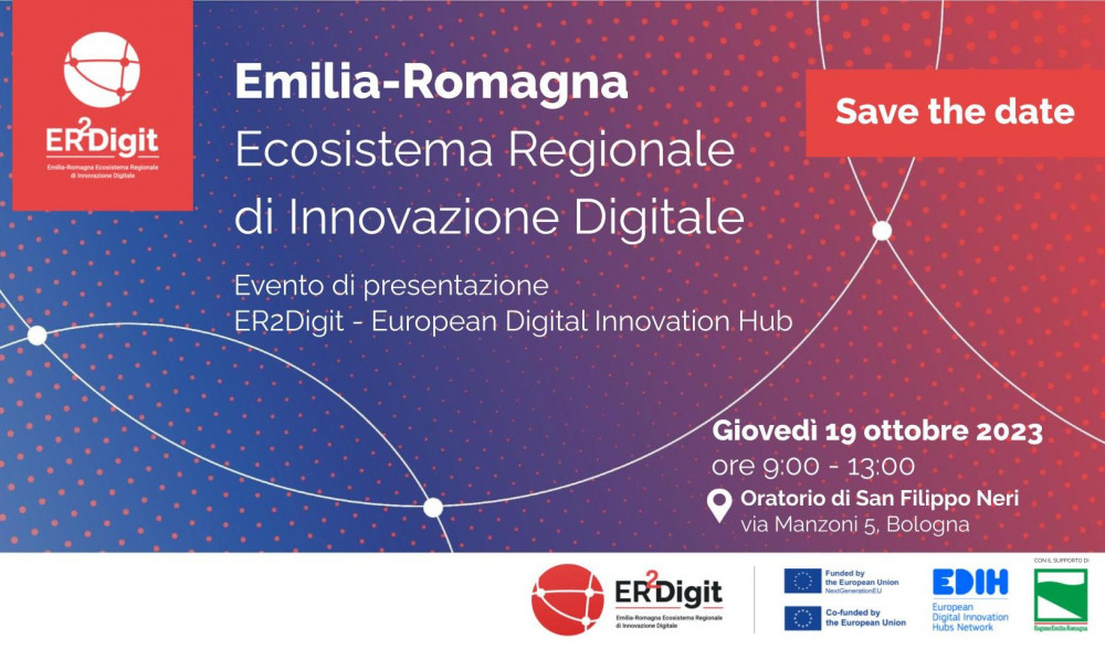 ER2Digit, European Digital Innovation Hub (EDIH) dell’Emilia-Romagna, incontra i rappresentanti di Pubbliche Amministrazioni e Imprese per presentare i propri servizi dedicati al territorio. L’incontro è previsto giovedì 19 ottobre 2023 dalle ore 9.00 alle 13.00 presso l'Oratorio di San Filippo Neri a Bologna.