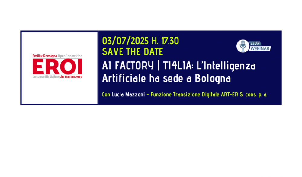 Nel prossimo incontro di EROI TALK (vedi tutti gli appuntamenti) abbiamo chiesto a Lucia Mazzoni, dalla Funzione Transizione Digiale di ART-ER, maggiori informazioni sul programma AI FACTORY | AI4LIA che sta seguendo dalla suo avvio.