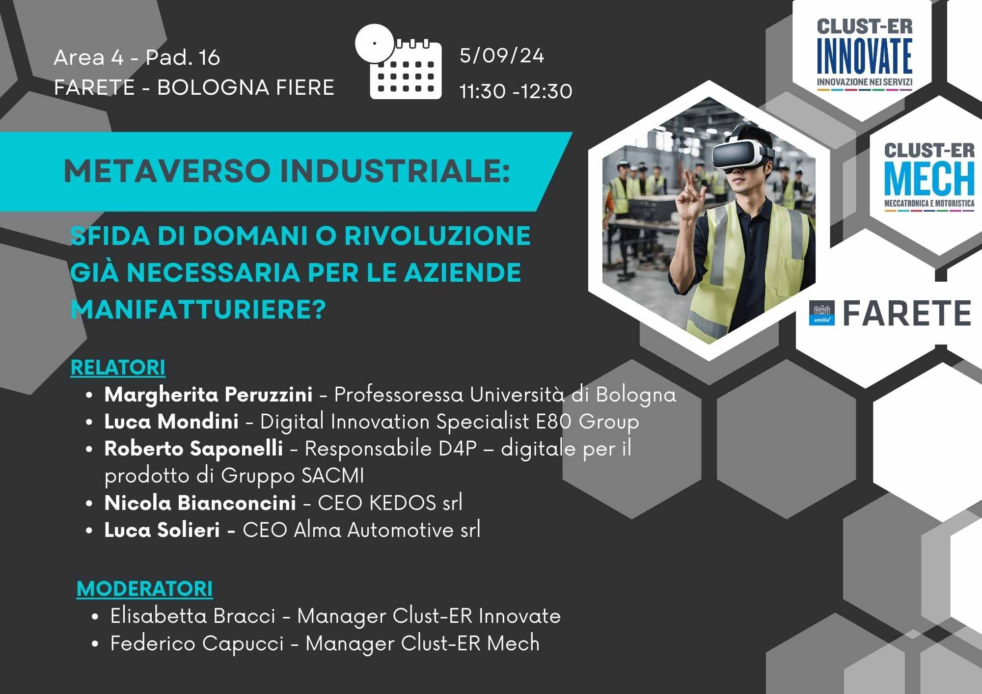 Quest’anno il Clust-ER MECH – in collaborazione con il Clust-ER INNOVATE – organizza due workshop dedicati rispettivamente al Metaverso Industriale e all’AI e Robotica Industriale.