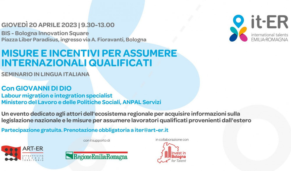 Il workshop, che si terrà giovedì 20 aprile 2023, dalle ore 9.30 alle ore 13.00 presso BIS Bologna Innovation Square (Piazza Liber Paradisus, ingresso da Via A. Fioravanti - Bologna), è rivolto in particolare ai referenti di aziende, enti accreditati ai servizi per il lavoro, uffici placement di università e centri di ricerca, interessati al tema dell’attrazione di talenti internazionali.